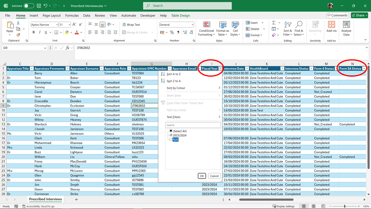 To get the numbers needed for questions like "How many doctors in your health board with a prescribed connection was appraised in year XX/YY?" you will need to filter the table columns in Excel.