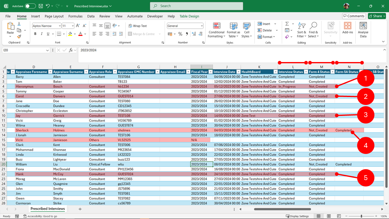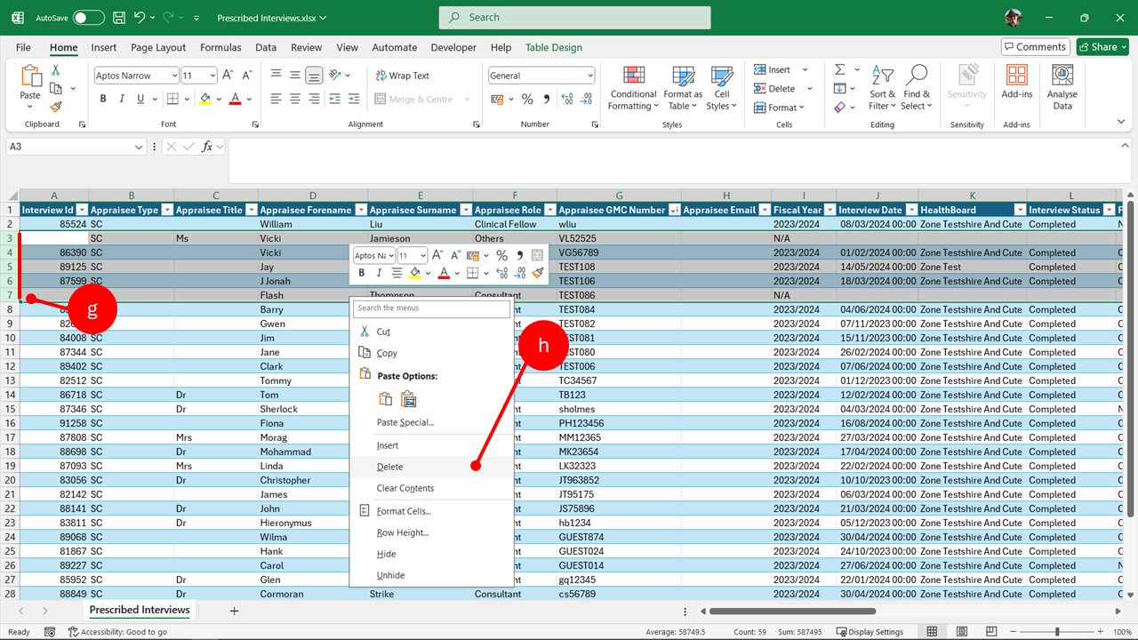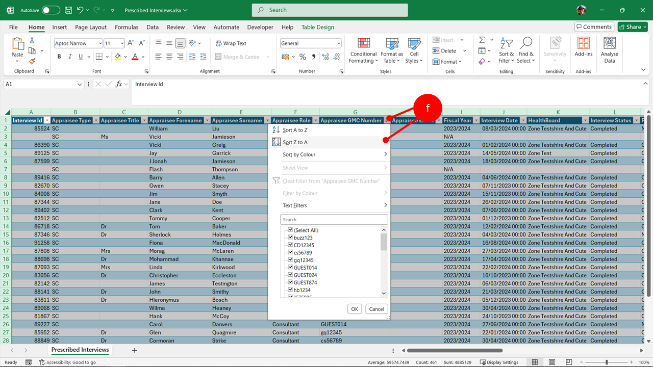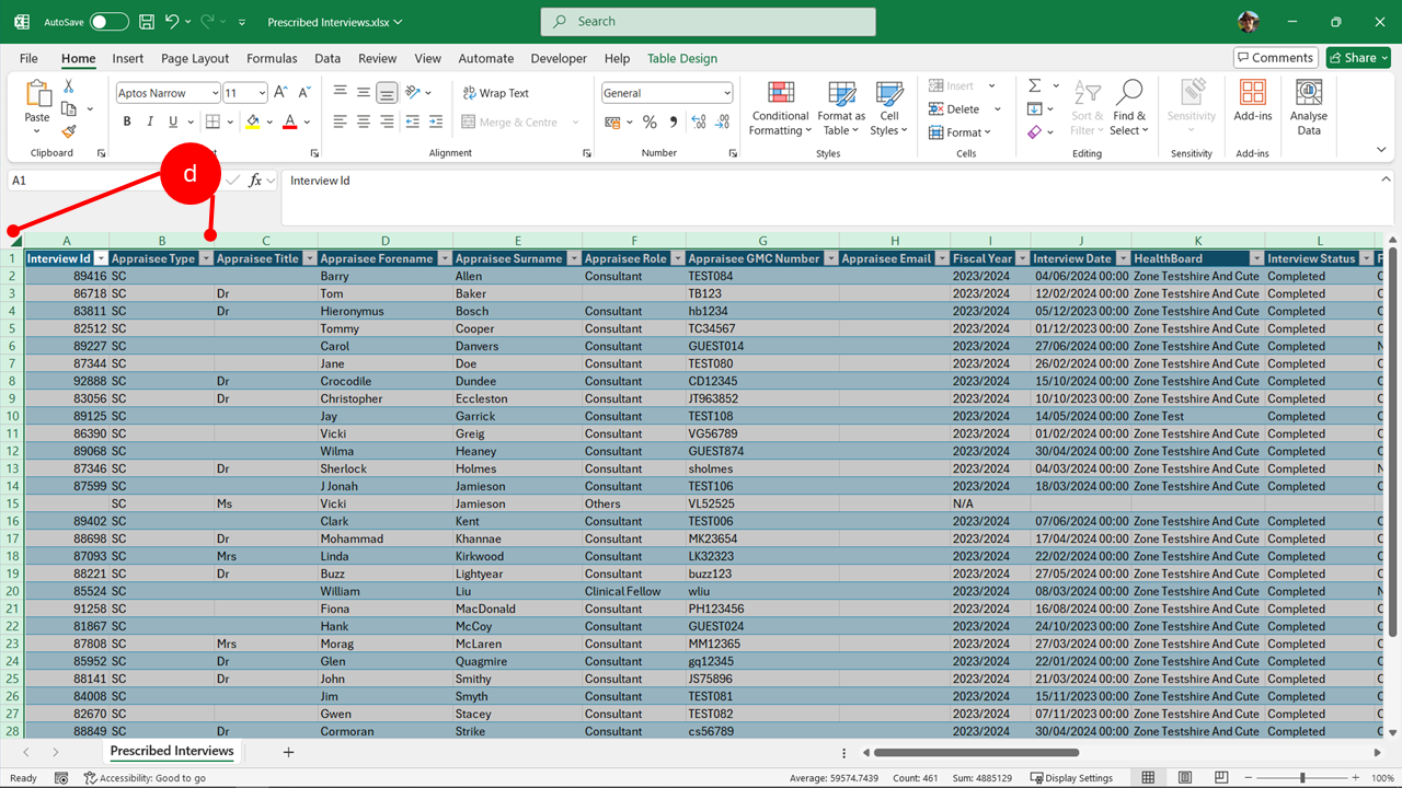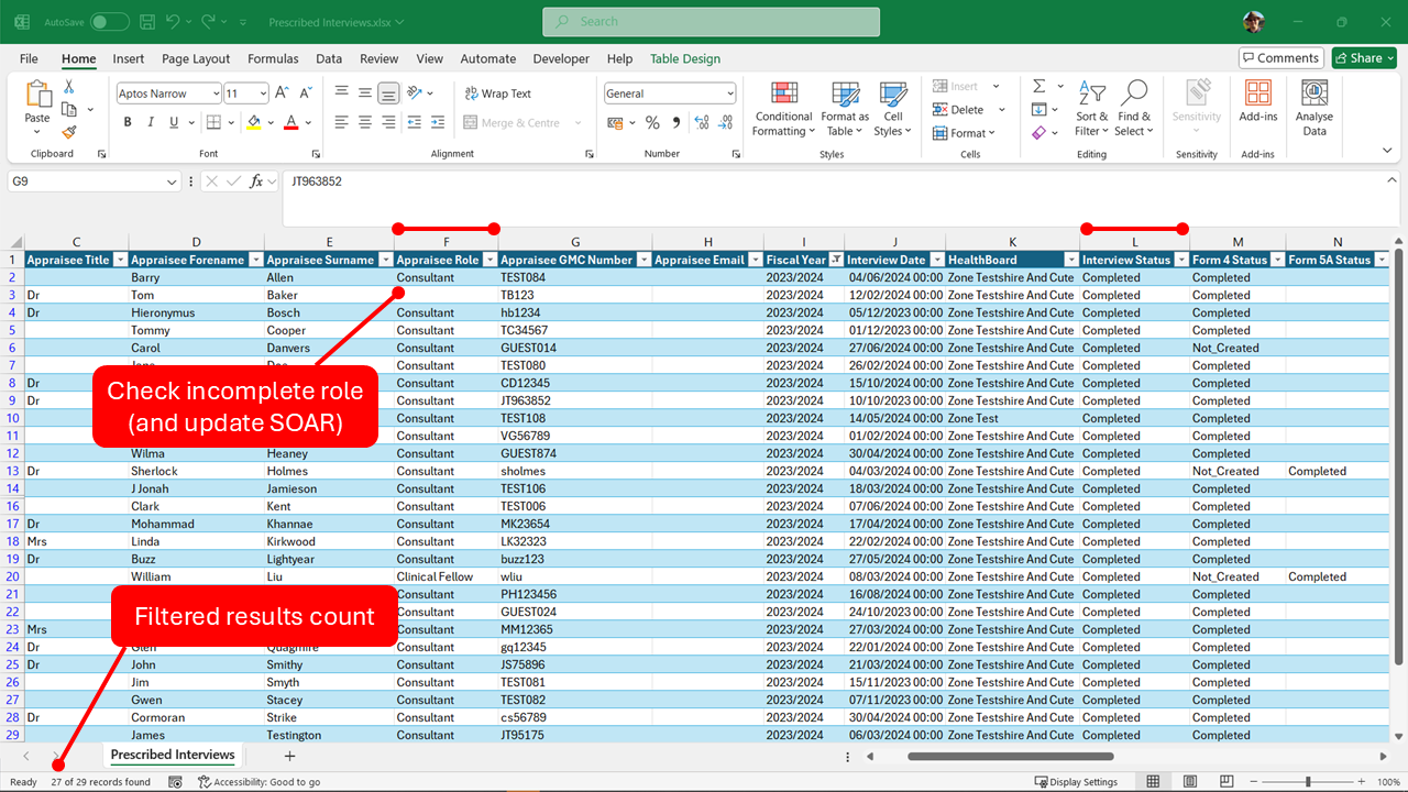 To get the number of completed appraisals for different doctor groups, set column L (Interview status) to "Completed", and then set the filter in column F (Appraisee Role) to select the different groups. You will find the numbers in bottom left of workbook.