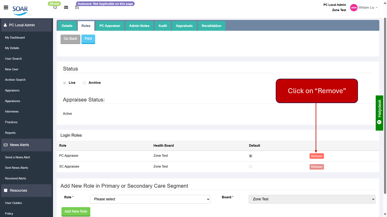 If the user has other roles outwith your health board and depending on circumstance (e.g. appraiser leaving due to relocation etc) you may wish to reach out to the other health board admin teams to let them know.